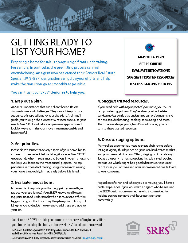 For seniors, in particular, the pre-listing process can feel overwhelming. An agent who has earned their Seniors Real Estate Specialist® (SRES®) designation can guide your efforts and help make the transition go as smoothly as possible.